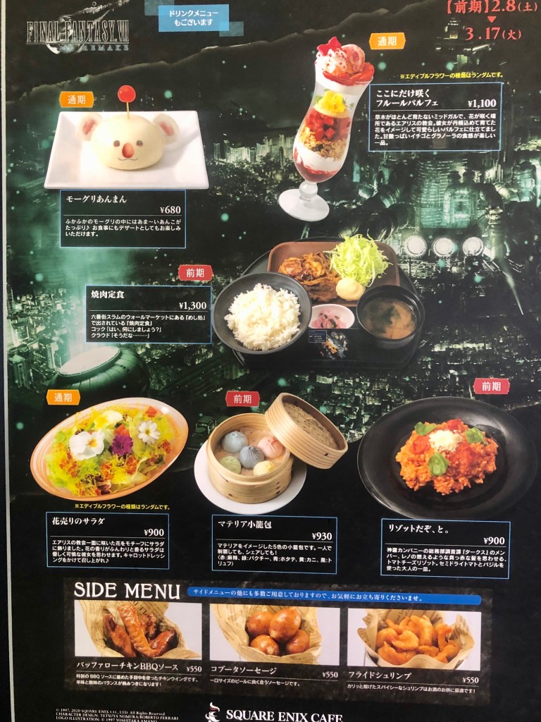 If you’re confused by the dates on the menu, they are there to indicate that it is split up into two parts. The first part finished on March 17, 2020 and featured items like Materia Dumplings – a collection of five multi-colored dumplings inspired by the use of magic in the game, and Moogle Bread – which contained a traditional Japanese red bean paste as a filling.